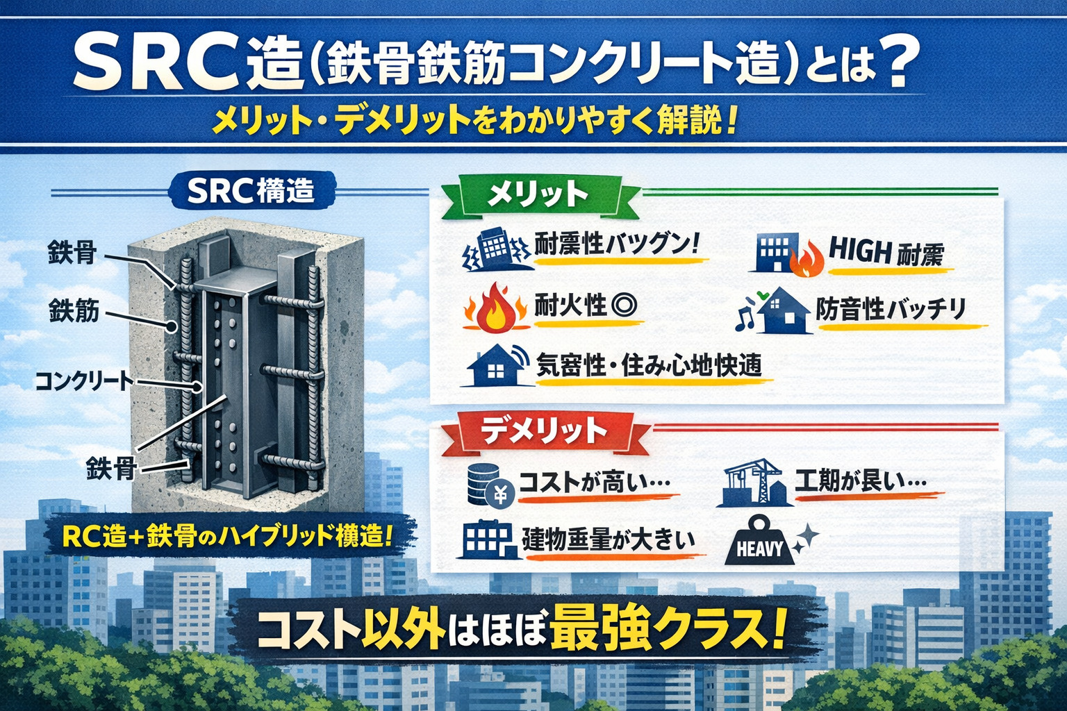 SRC造(Steel Reinforced Concrete)は、日本語で鉄骨鉄筋コンクリート造と呼ばれる建物構造です。