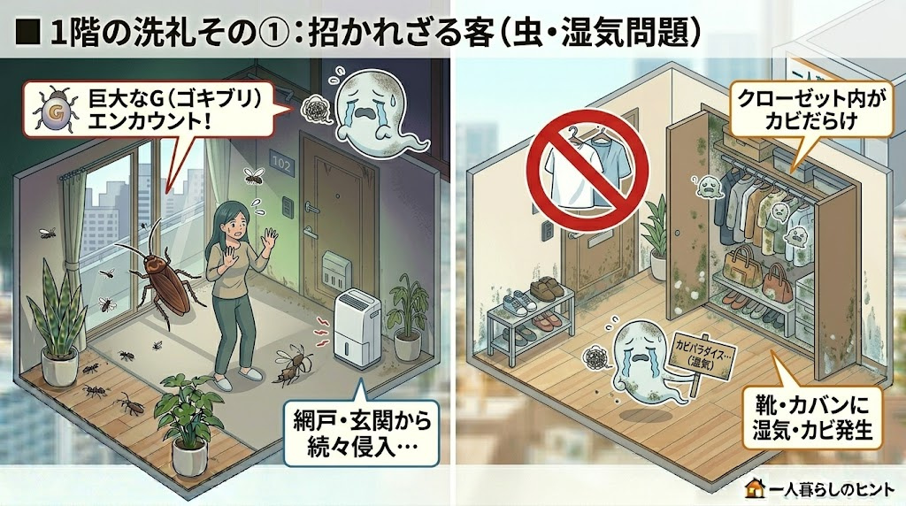 地面からの湿気でカビパラダイス: 2階以上の部屋に比べて湿気が溜まりやすく、油断するとクローゼットの服や靴がカビだらけに…という悲劇も。