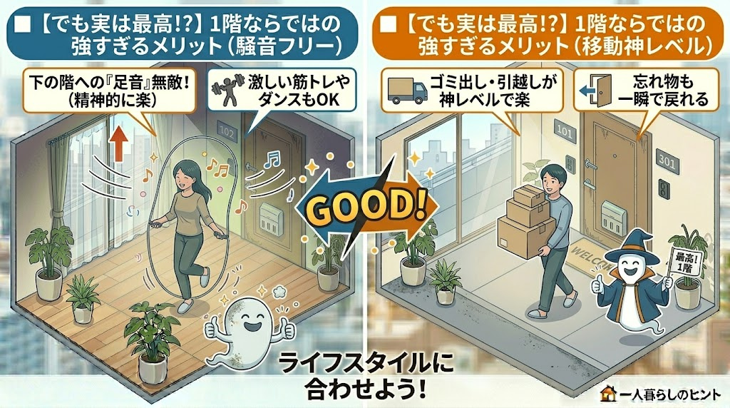 1階は「虫が絶対に無理」「セキュリティ重視」という人には不向きですが、「足音を気にせず生活したい」「とにかく家賃を抑えたい」という人にとっては、対策さえすれば最高のコスパ物件に化けます。自分のライフスタイルと相談して決めてくださいね!